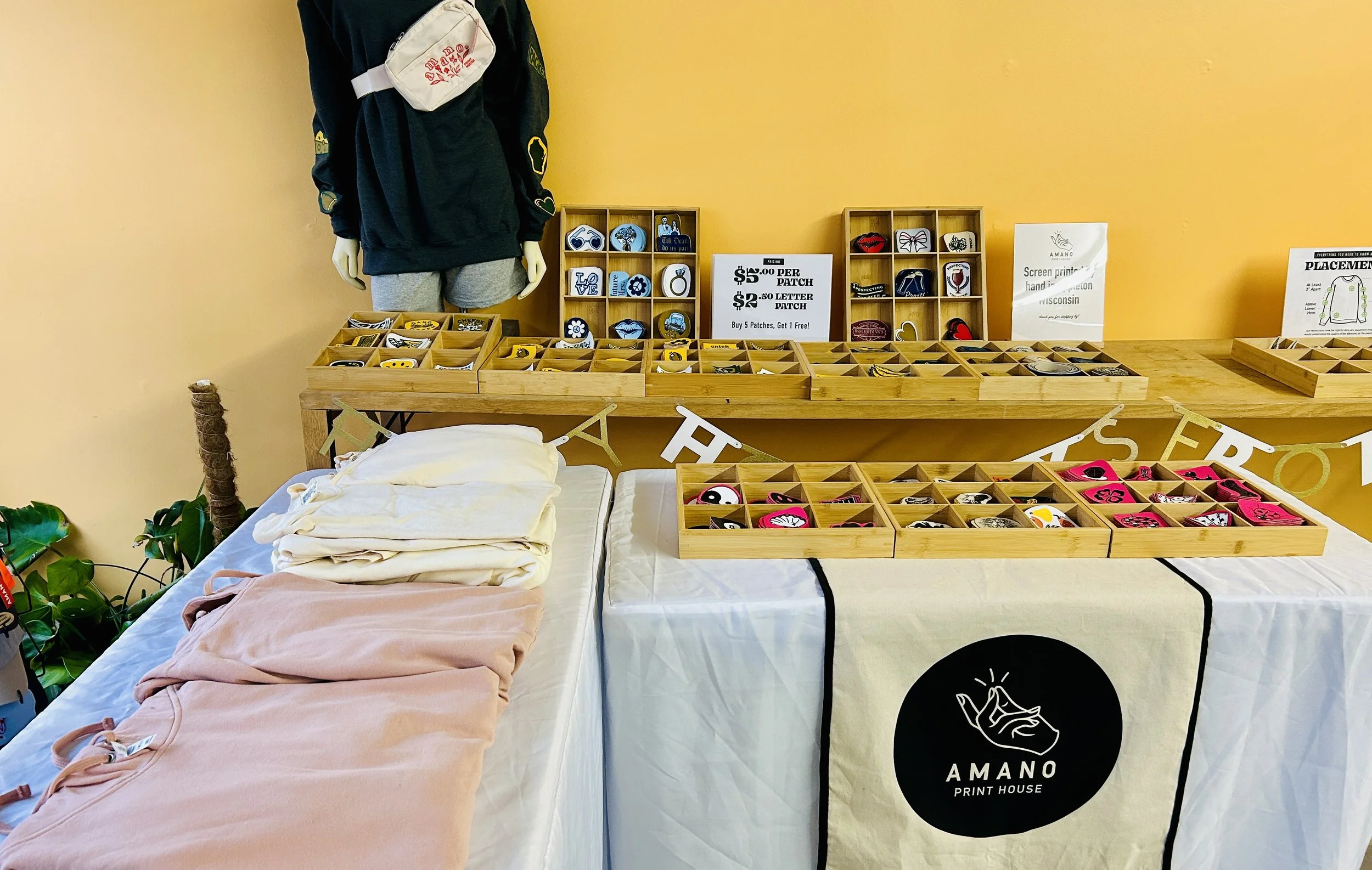 Amano Print House hosts Patch Bar Events throughout the year for the Fox Cities Community. These are creative and exciting events where individuals can create custom garments and accessories using our screen-printed patches, made in-house.